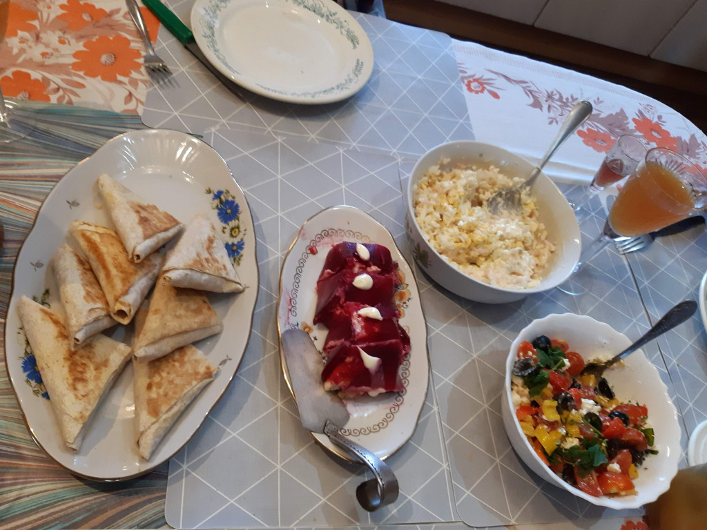 Пирожки, тортик, салатики, селёдка шубой . Муж курочку запекал. Сын в гости приехал. За полгода отсутствия. Мамочка же должна была побаловать чадо свое 2хметровое))) Поэтому все настоящее. Без снеговиков))) точнее со снеговиком он сфотографировался. Показать друзьям снег настоящий)))