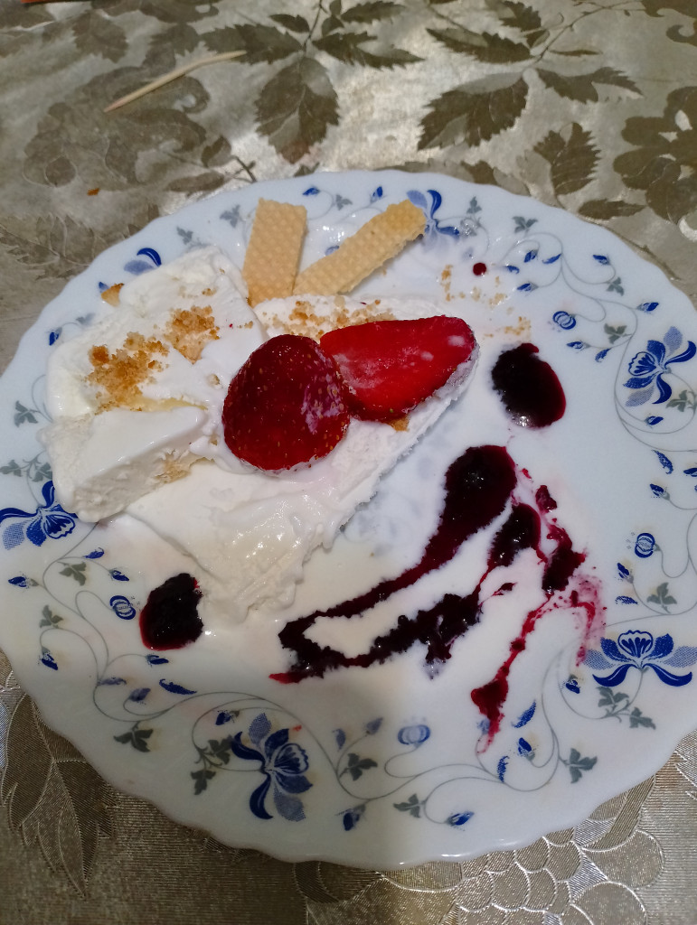 Вот это сделала я (всеми правдами и неправдами я его уговорила немного постоять) А дочь решила с ресторанным подходом сделать (конечно, ресторатор из неё пока никакой, но она очень старалась)