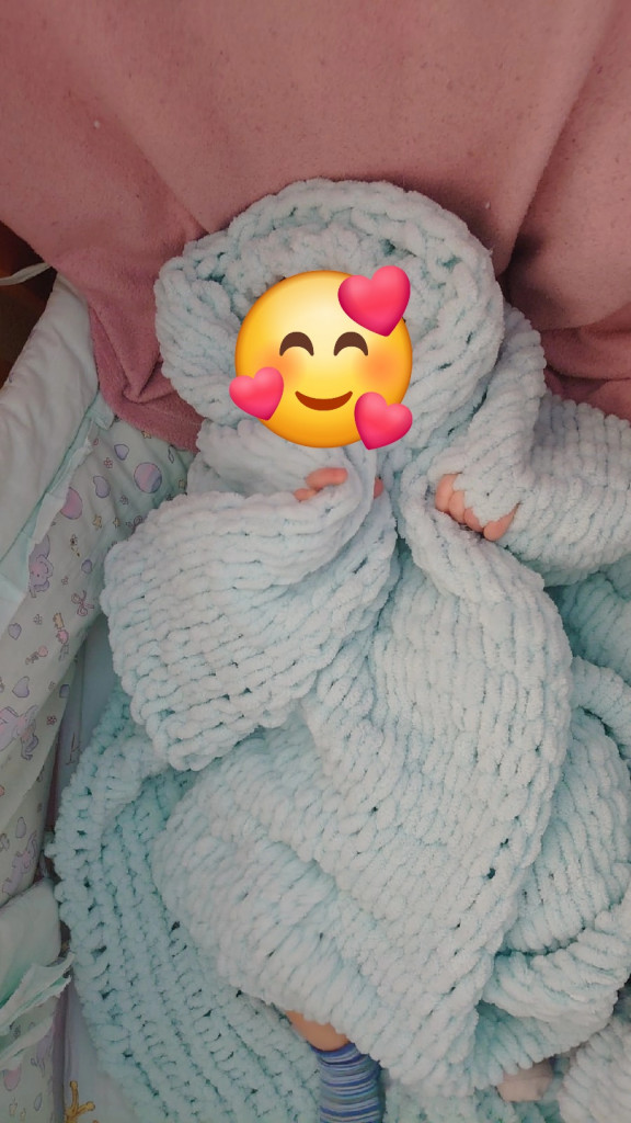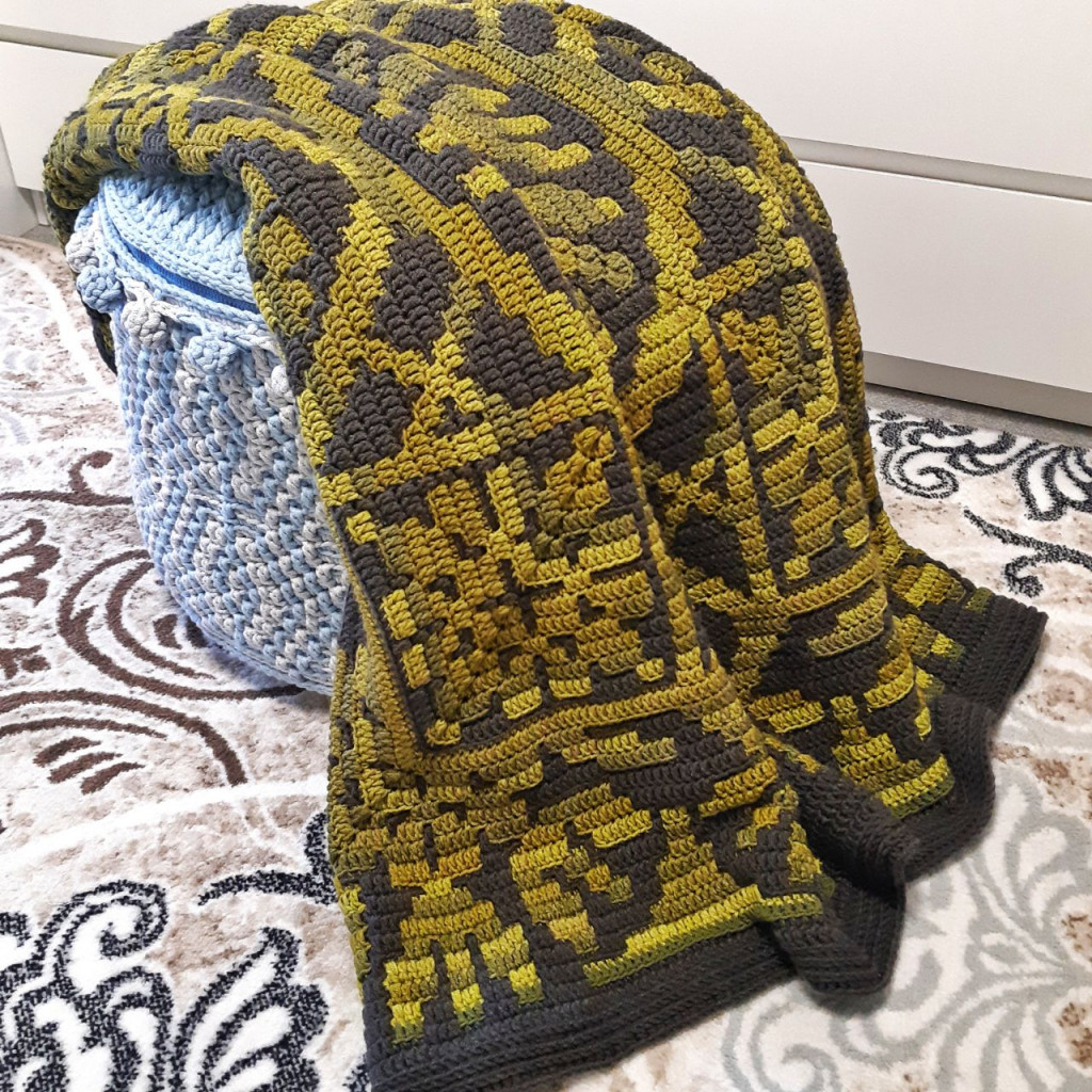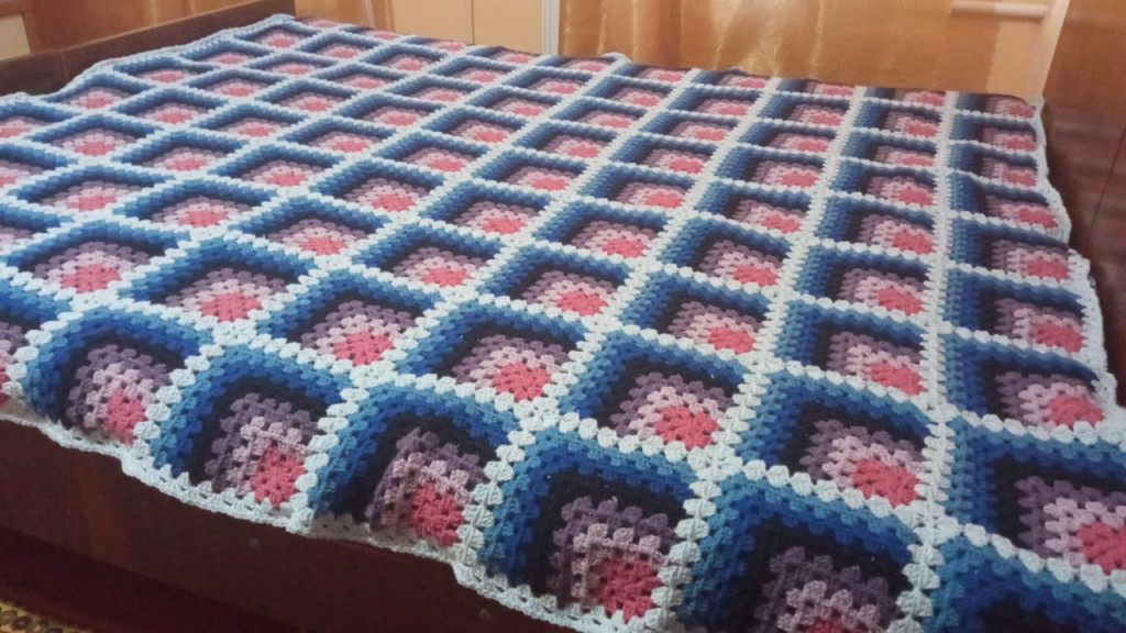 Я хотел бы поделиться с вами результатом своей работы. Я связал плед на пальцах для своего любимого крестника.