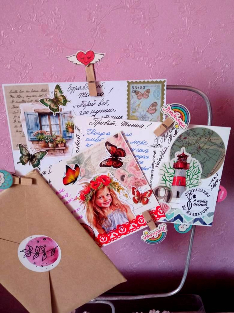 А у меня очаровательный конверт от Оли @lelyoka72 !!! Такой яркий! И Алфавит: П- подружки, Ю - юная модница! А открытки какие красивые, из и подписывать то не надо - такие фразы суперские!