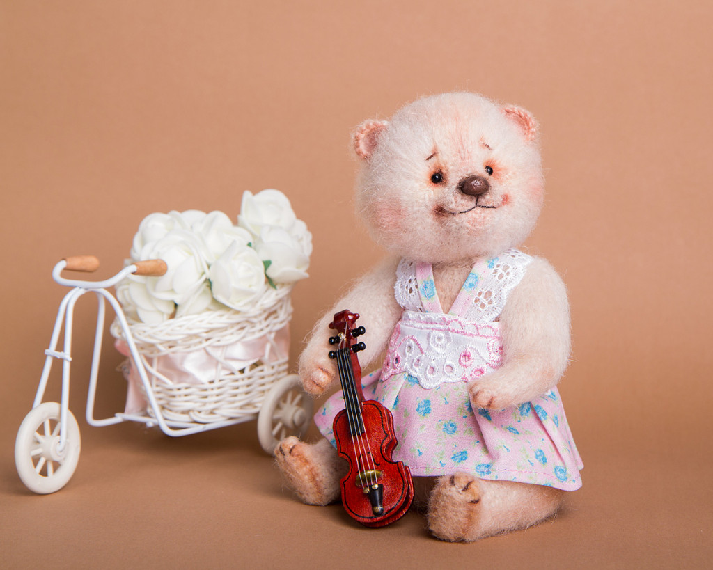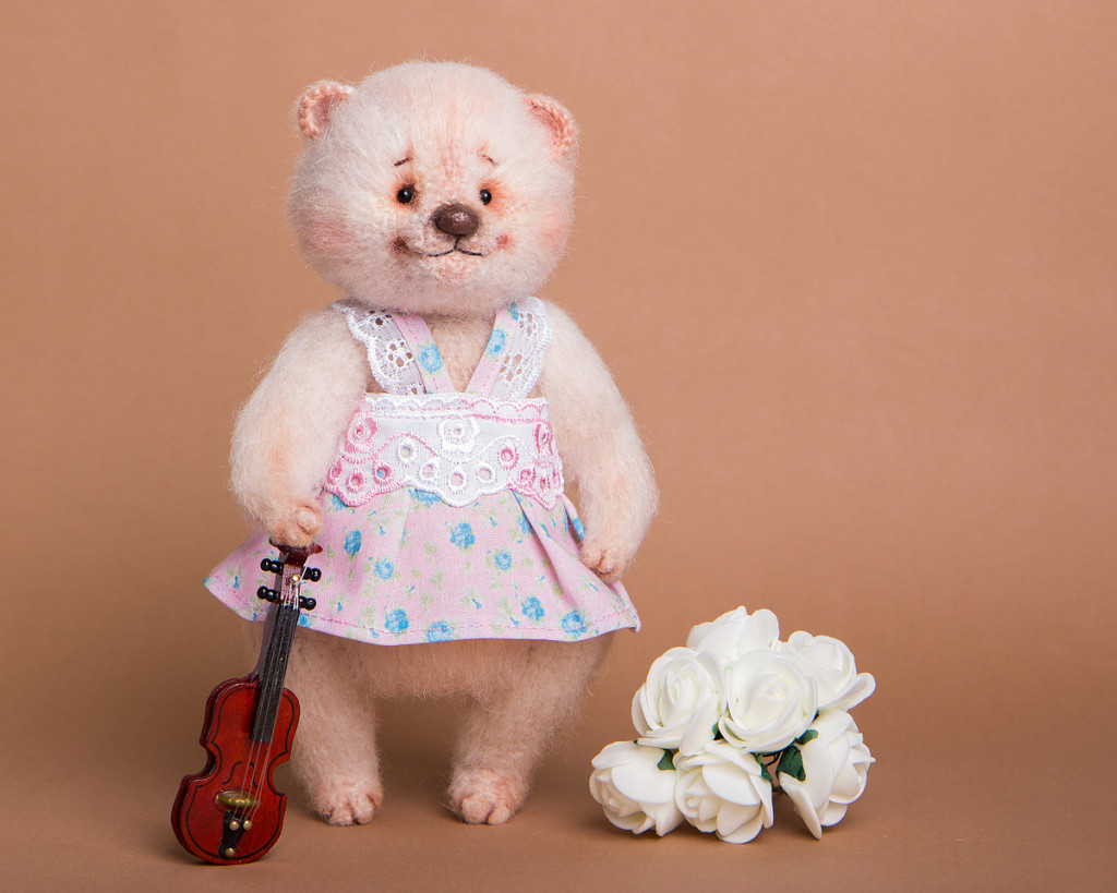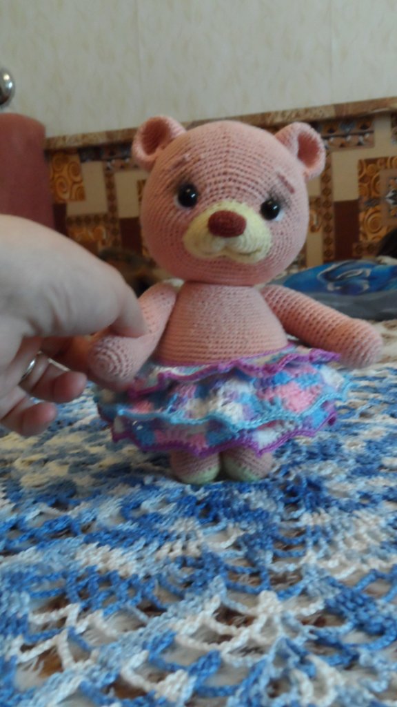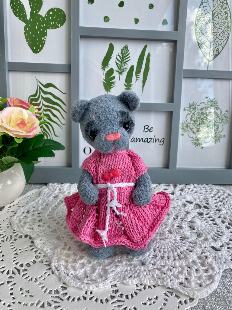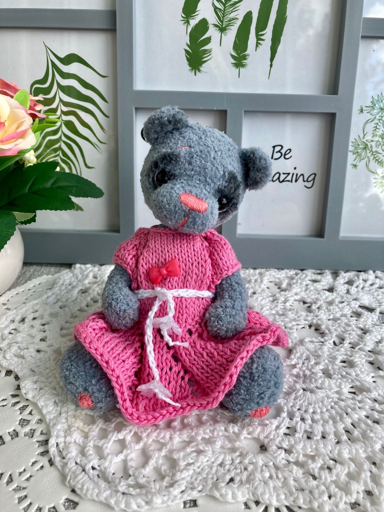 Мишутка Стеша связана в рамках тестирования МК "Урсула" Анны Будановой . Сидя 15 см, стоя 18 см. Стоит с поддержкой. Выполнена в стиле тедди: лапки и голова подвижны, на шплинтовом креплении. Платье снимается.