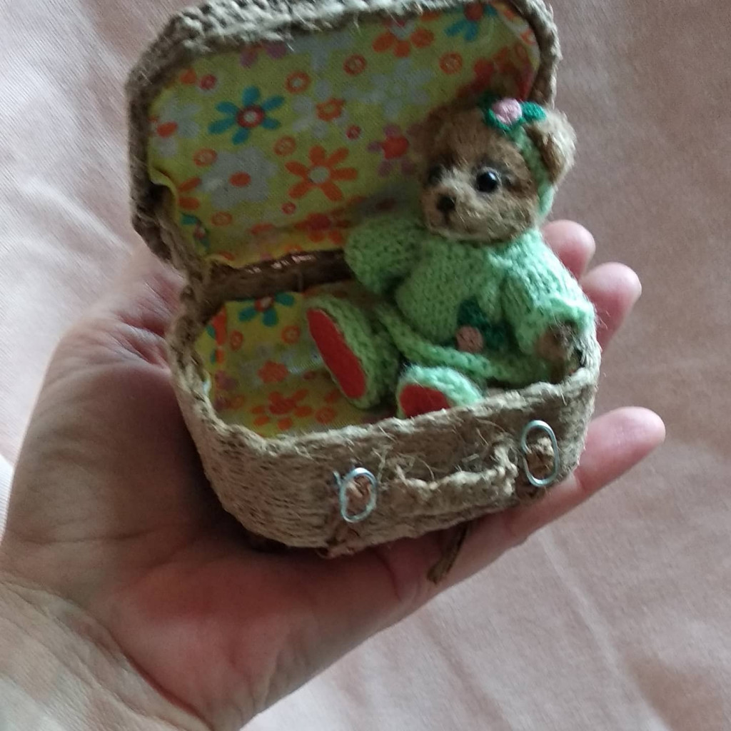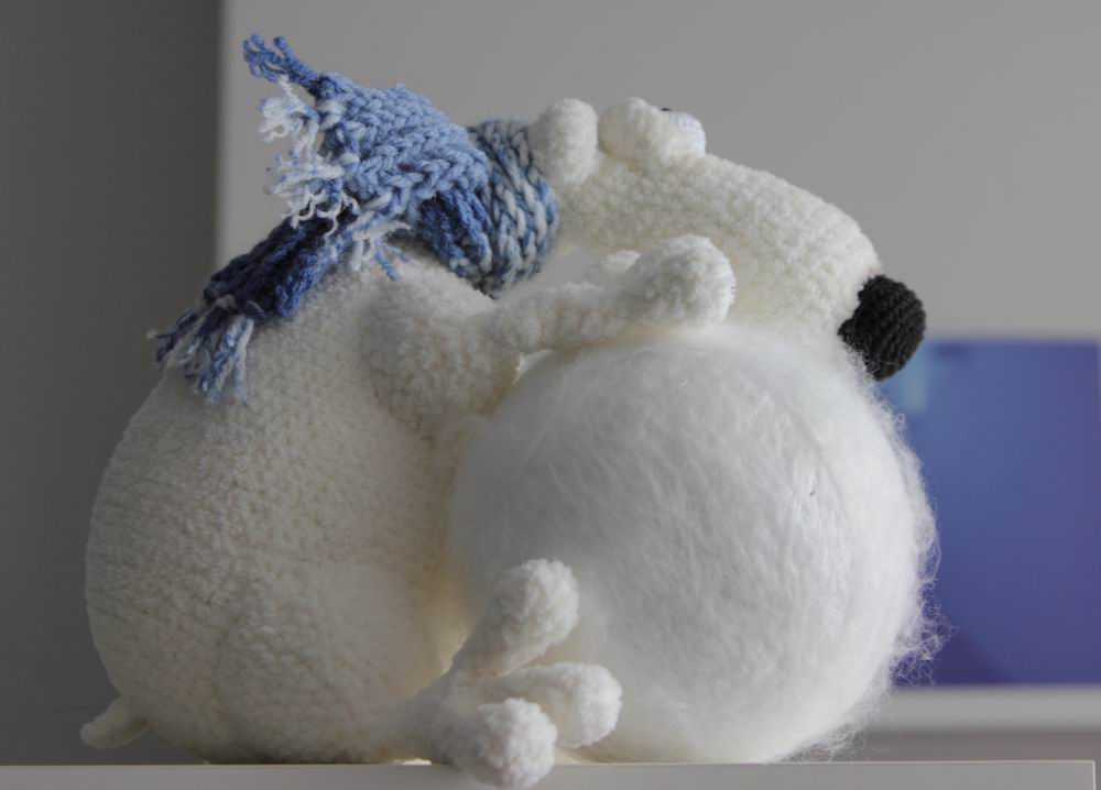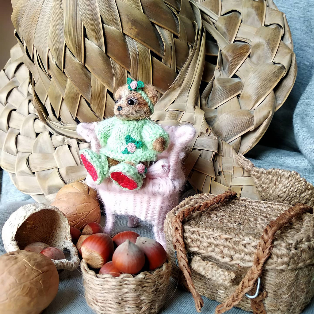 Лотти связана из итальянской бобинной пряжи. Сделана по принципу тедди, то есть пять шплинтовых креплений, лапы дополнительно армированы проволокой. Получилась примерно 27 см стоя
