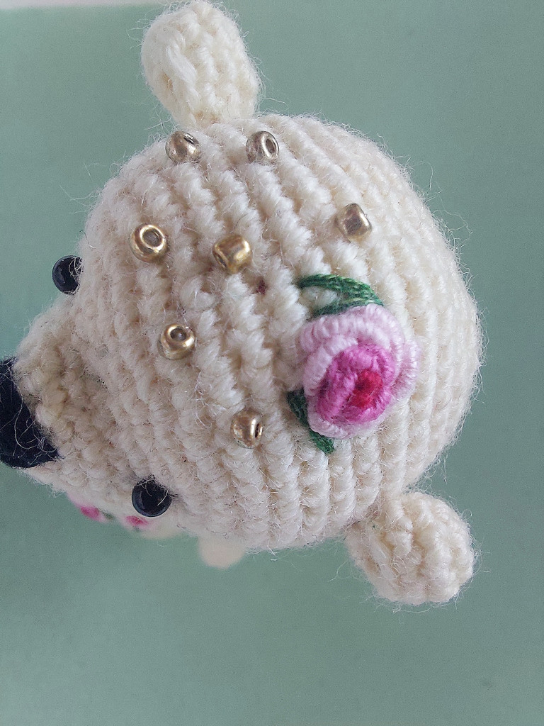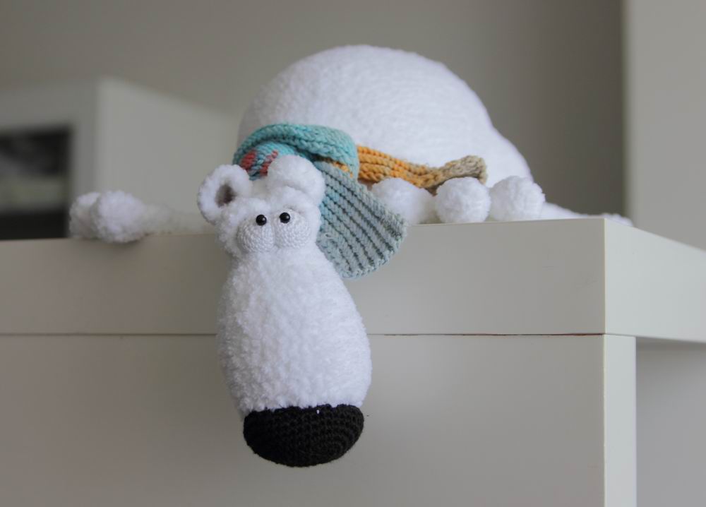 Пандочка связана из китайской пряжи юнайс + турецкий кидмохер. Получилась примерно 18см сидя и 23см стоя. Лапы и голова на шплинтовом креплении, лапки армированы. А еще у нее есть подвижная вариативная шея, благодаря ей барышня может гордо задрать нос или скромно потупить глазки.