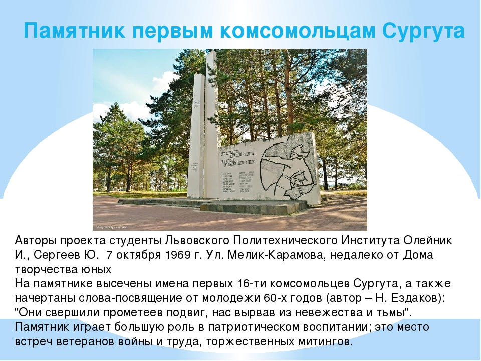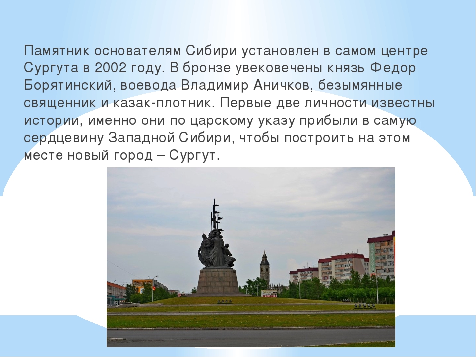 Сургуту в этом году исполняется 429 лет. В 1594 году была основана деревянная крепость, куда впоследствии ссылались участники восстания Степана Разина и декабристы. Но свое развитие город начал в 60-е годы 20 -го столетия, когда началось освоение нефтяных и газовых месторождений. Сейчас Сургут является одним из богатых промышленных городов. Достопримечательности у нас тоже есть, хоть их не так и много. , ещё у нас есть памятник улыбке (Щука с русалкой) , единственный в России памятник медсестре (у травматологии) , а также свой Биг Бен (школа иностранных языков) .