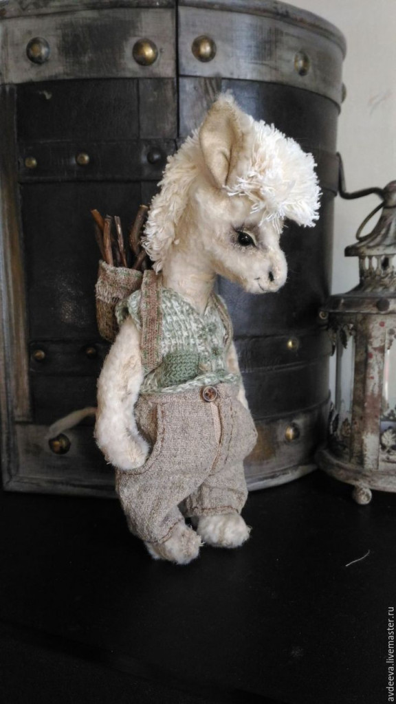  Любая пряжа – меховушка или содержащая мохер, подходящего цвета метражом 100г/700 м в две нити или 100 г/500 м примерно 30-40 г основного цвета и дополнительного белого – 5-10 г, Лебяжий пух или Травка черного цвета для гривы;