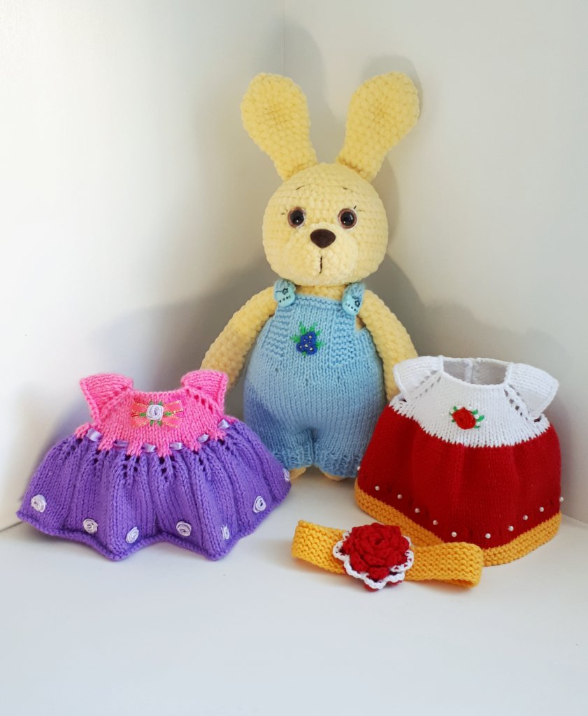 Зайка с приданым. Из какой-то плюшевой пряжи.