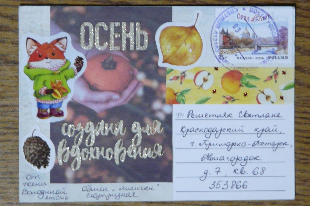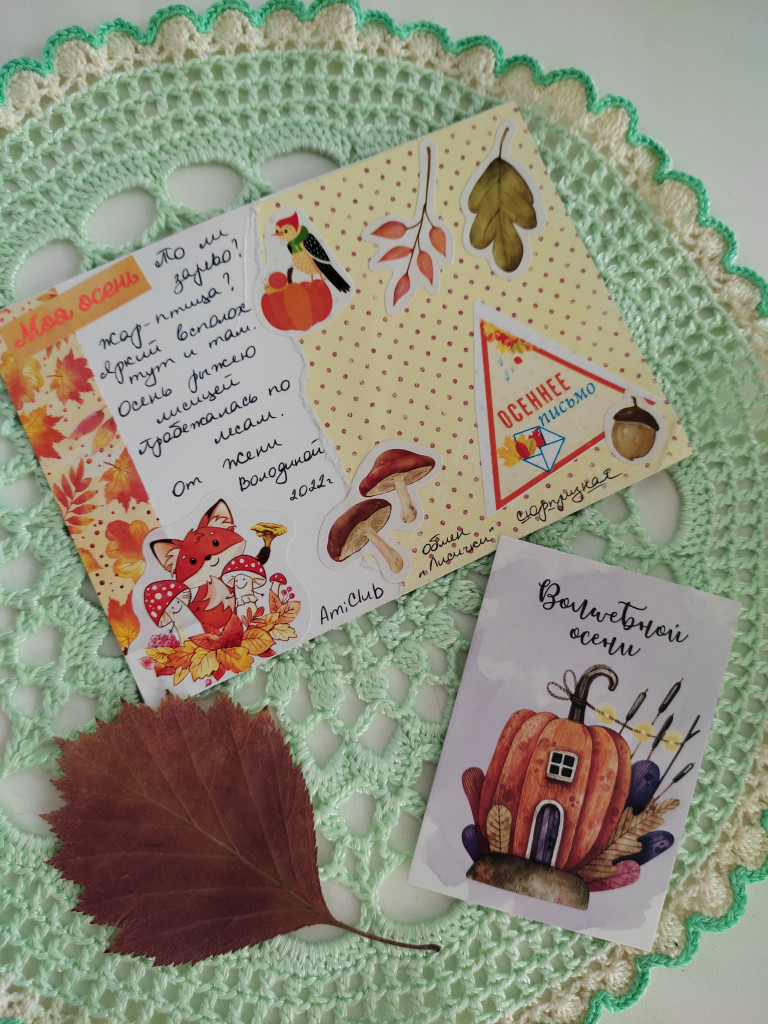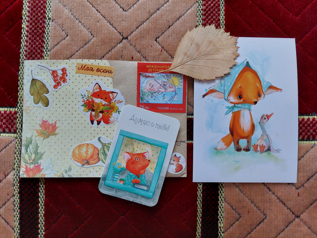 Смотрите какая красота! :greeting: А конверты тоже украшены и открытки. Женя мне даже листик осенний прислала и мини-открытку в мою коллекцию. :bravo: Я их тоже собираю.