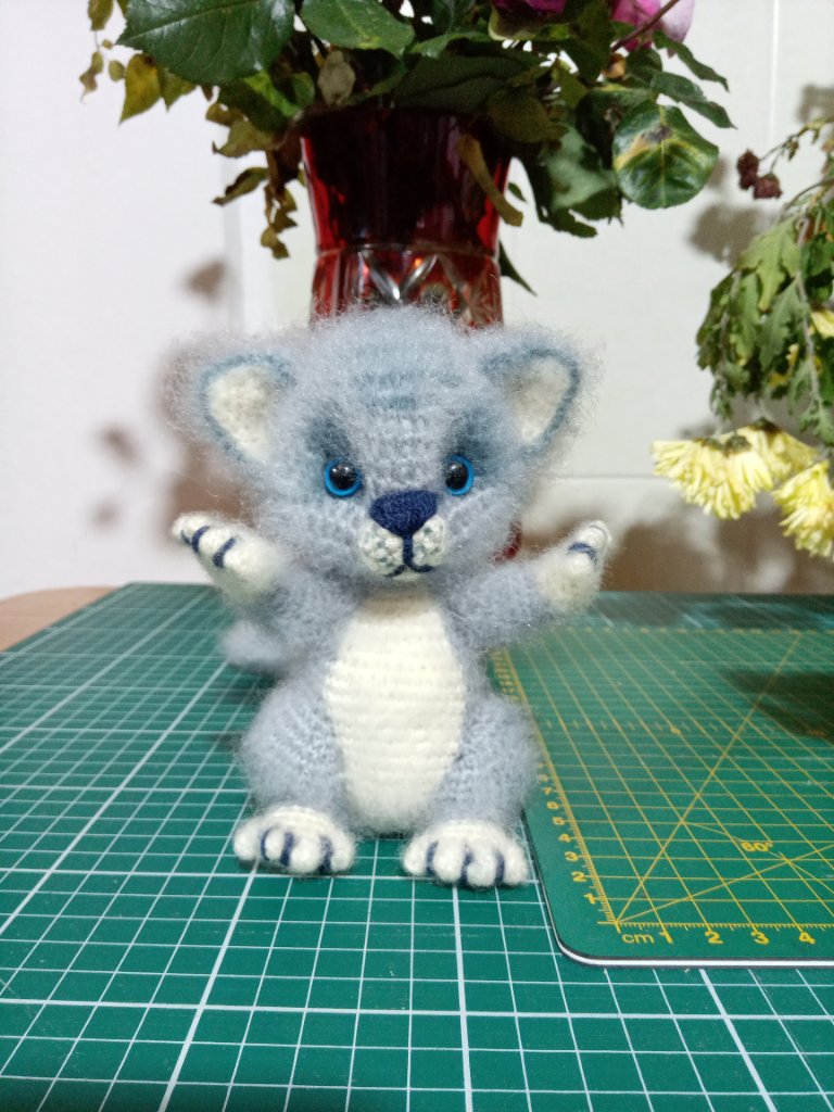 последняя моя работа, котик связан по картинке с пряжи джинс, рост 13 см.