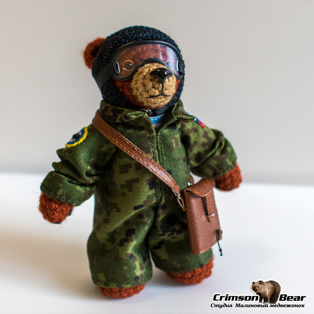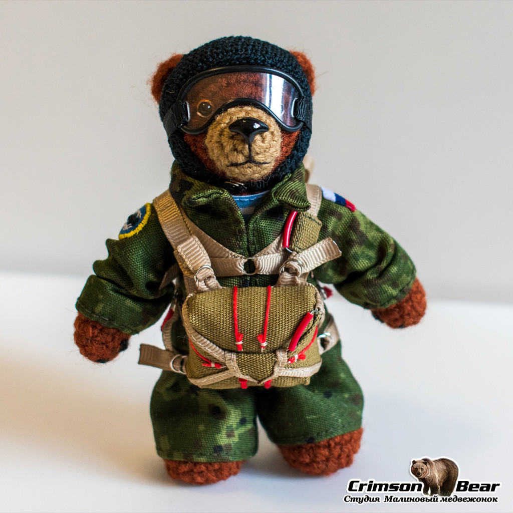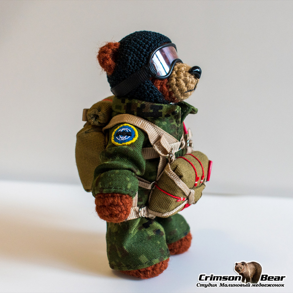 Мишка с парашютом Д-6 и нашивкой военной разведки. Размер 14 см. Лапы на проволочном каркасе, голова на шплинтовом креплении.