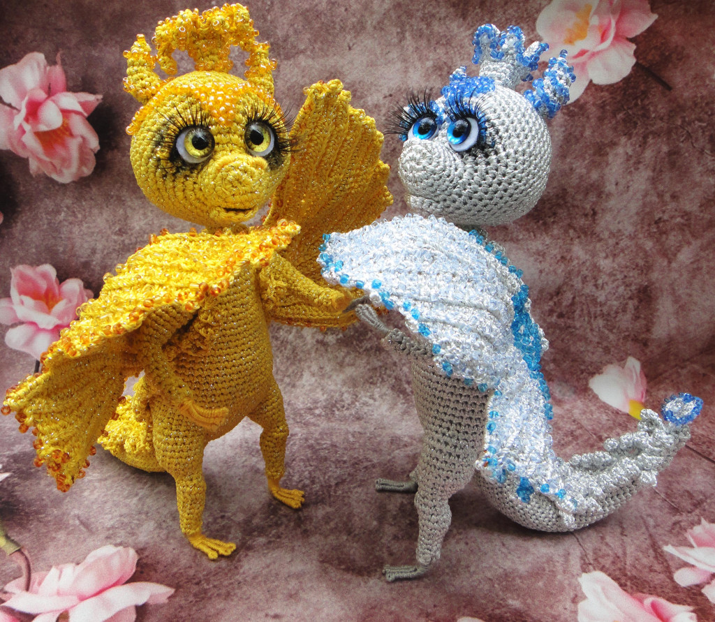 Дракоша ростом 16 см без учёта короны и рожек,связан из YarnArt Bright -пряжа с мерцающим блеском,игрушка на проволочном каркасе-ручки и крылья сгибаются,глаза стекло,дракончик в ручную расшит бисером.МК Татьяны Зинчук.