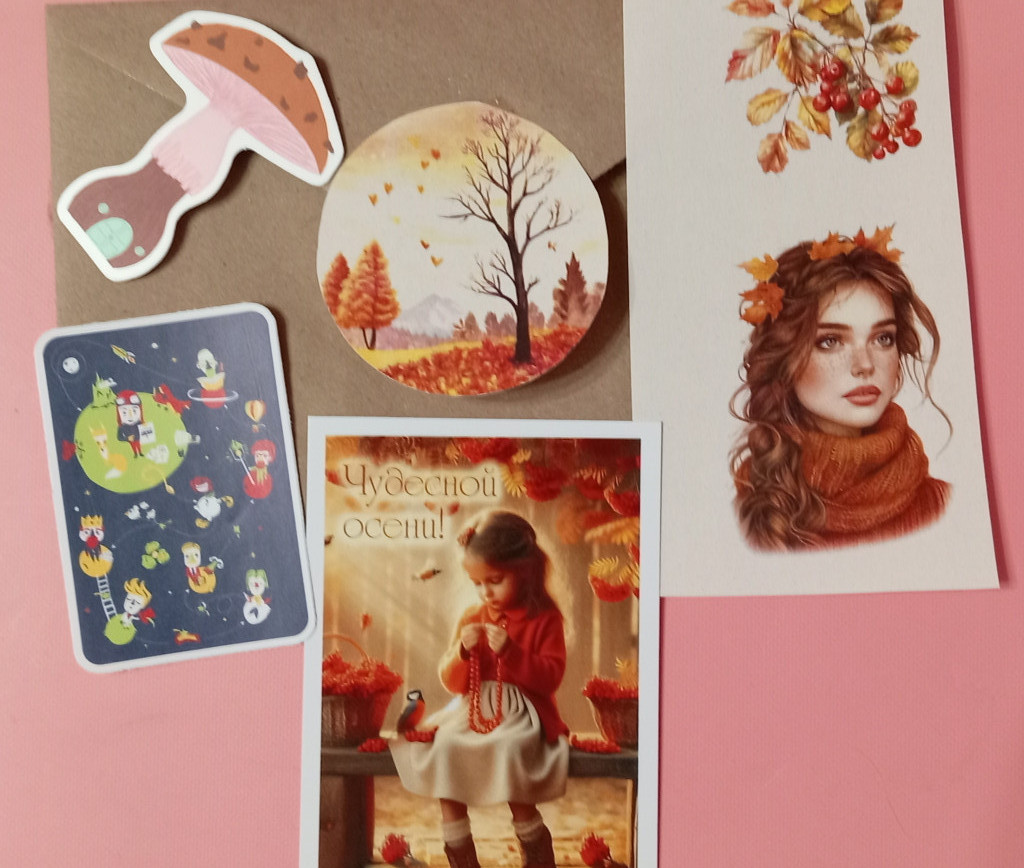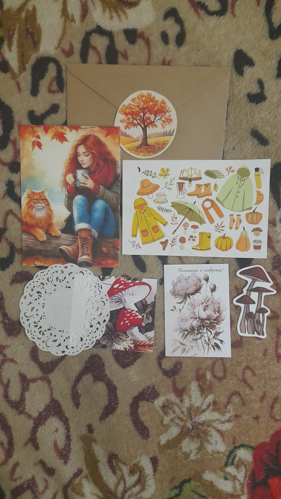И конверт с открытками Сумасшедшего обмена от Тани @Почтискрыльями , а с ними милая осенняя парочка!