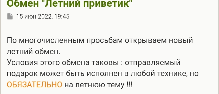 Условия этого обмена таковы : отправляемый подарок может быть исполнен в любой технике, но ОБЯЗАТЕЛЬНО на летнюю тему !!!
