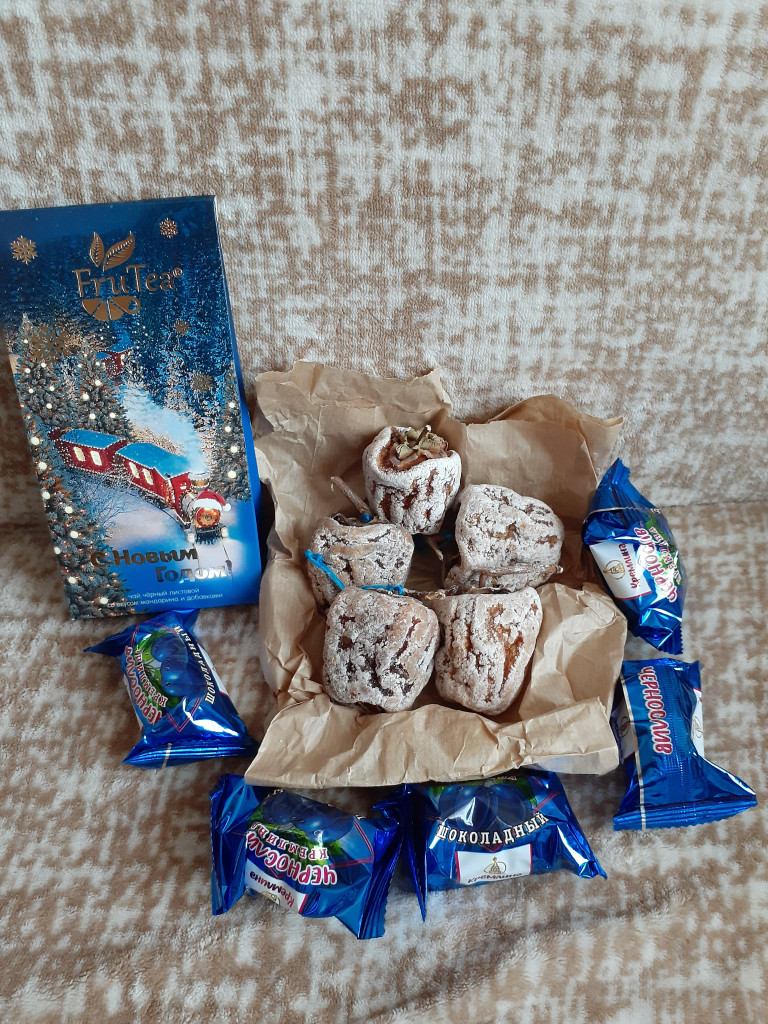 Света исполнила не одну мою мечту,мечтала я попробовать хурму вяленую, у нас не видела ни разу её в продаже. И вот теперь я её попробовала, ну очень вкусно она у меня с кофе пошла.Вкус напоминает немного груши, так мне показалась.Позже ещё покушаю может ещё какие нотки появятся :biggrin: Ну и конфетки мои любимые с чаем