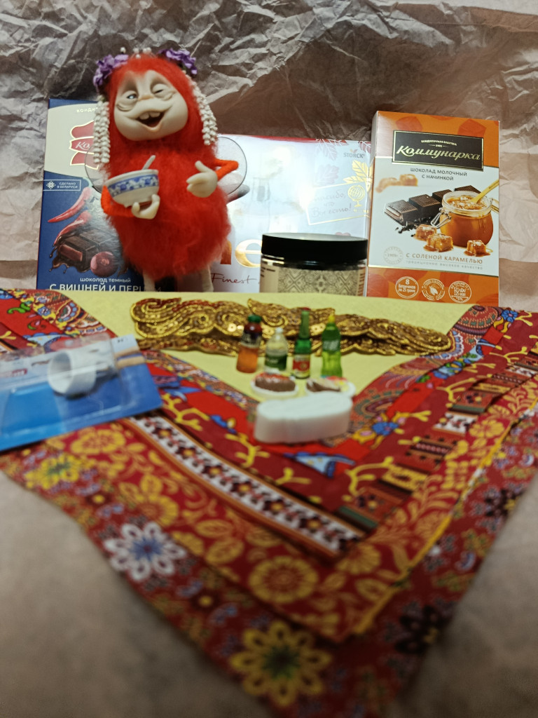 В коробке, под слоями тишью, всевозможных мешочков и коробочек, на самом дне лежал самый настоящий сюрприз В открыточке слова " Ты не любишь спицевые игрушки, а я связала спицами. Тебе не нравятся цветочки, а они там есть...". Вот скажите, товарищи, где видно, что это спицевая игрушка? И вязаных цветочков я тоже не увидела (да даже если бы они там были, то они чисто для украшательства) Какая прикольная мордаха у этого чудика! Мы долго над ней угарали