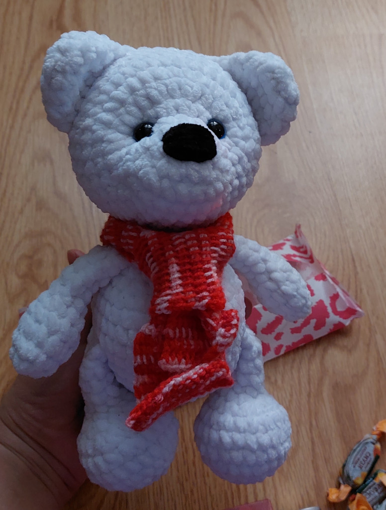 Белый мишка - главный герой посылочки. Приехал в обнимку с фонариком-елочкой. Теперь у меня дома дискотека