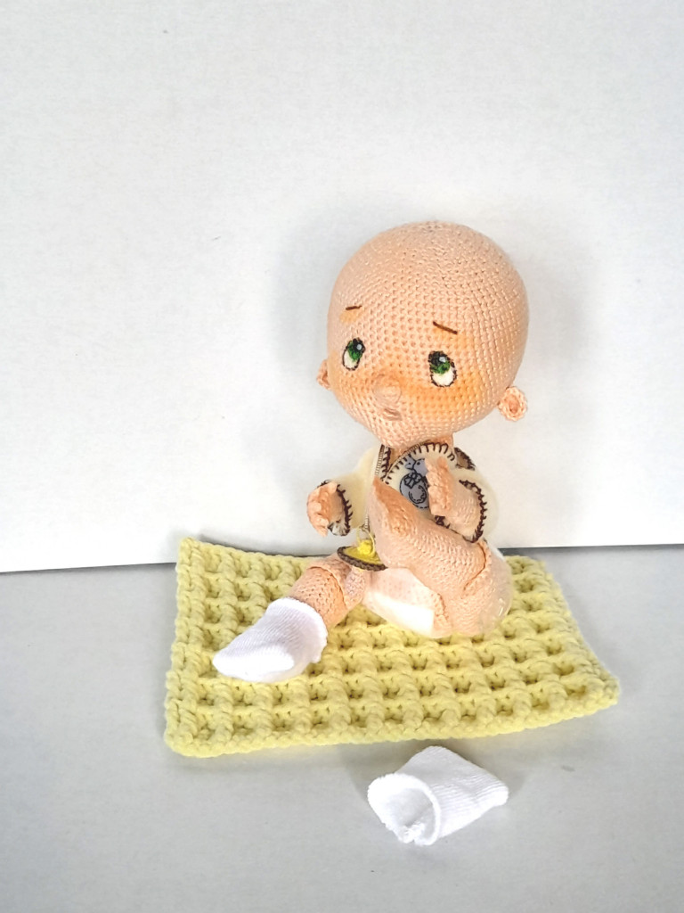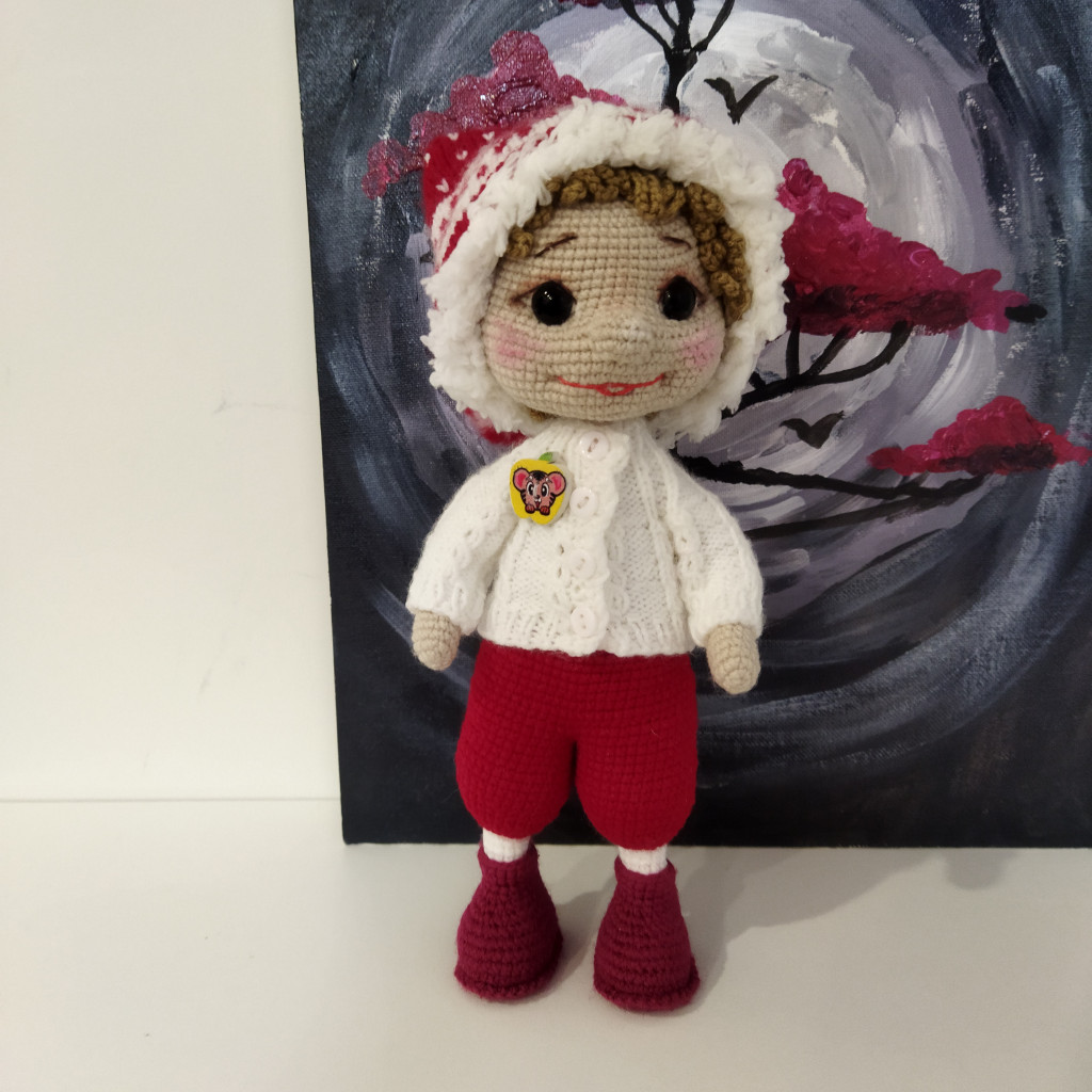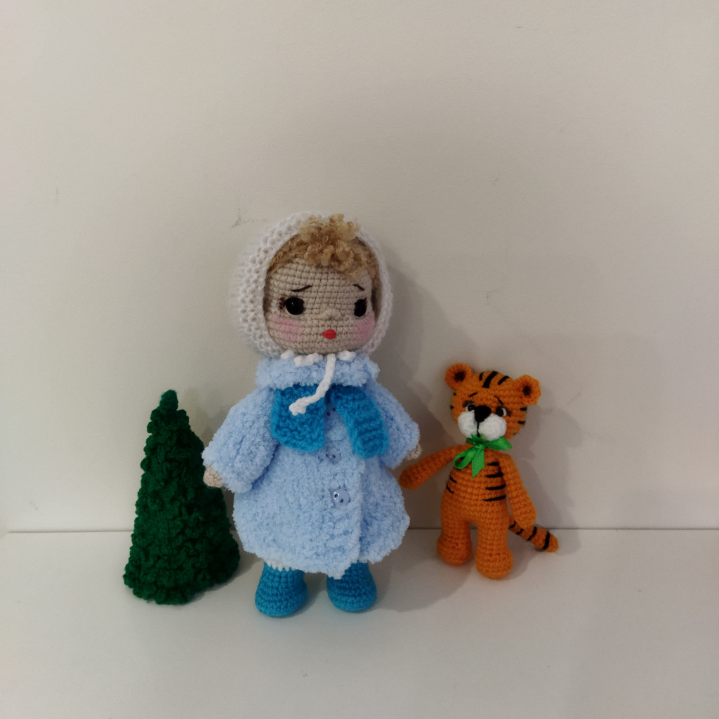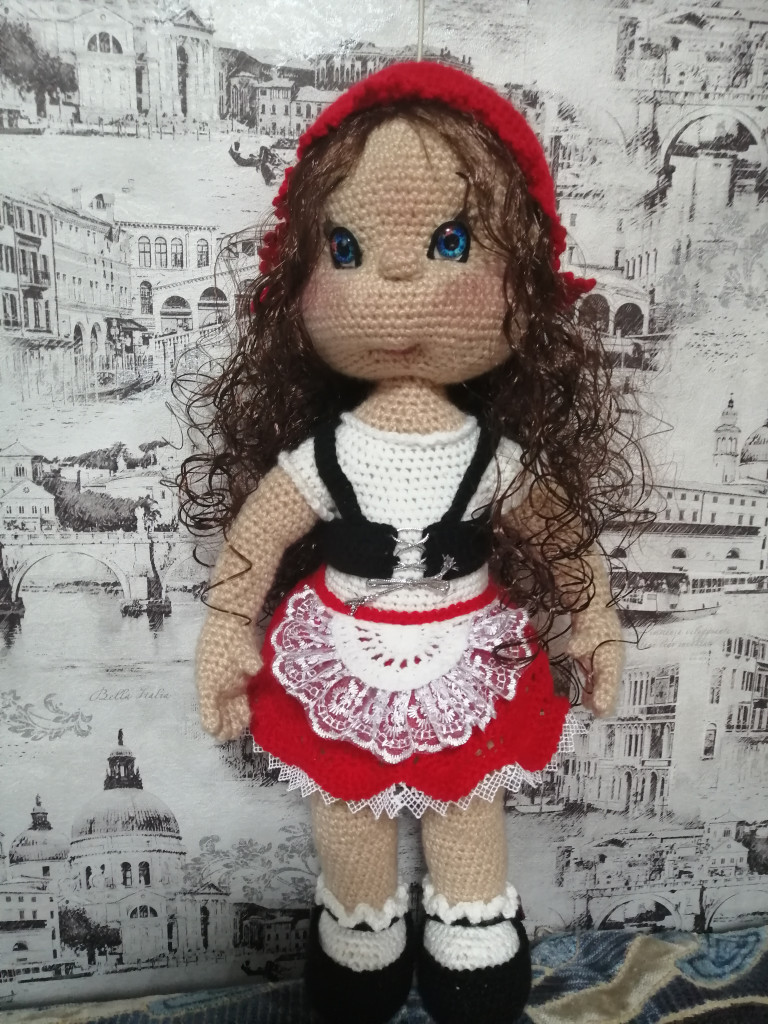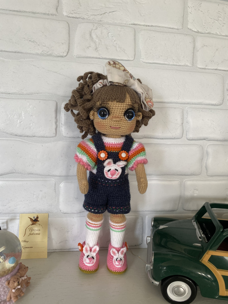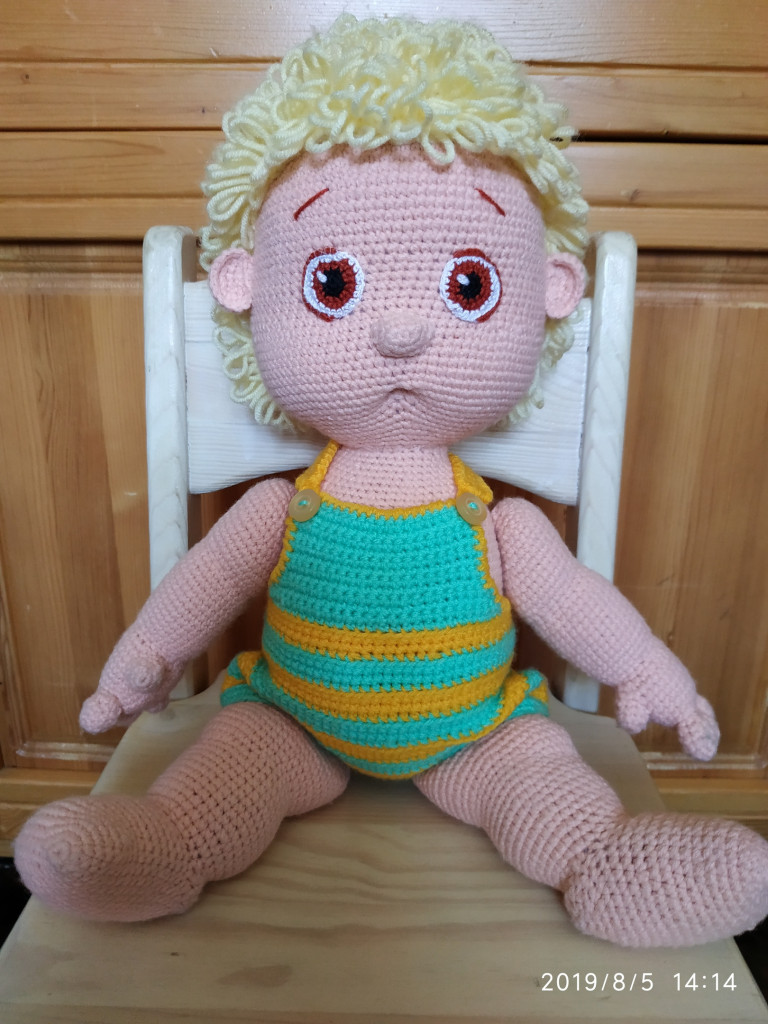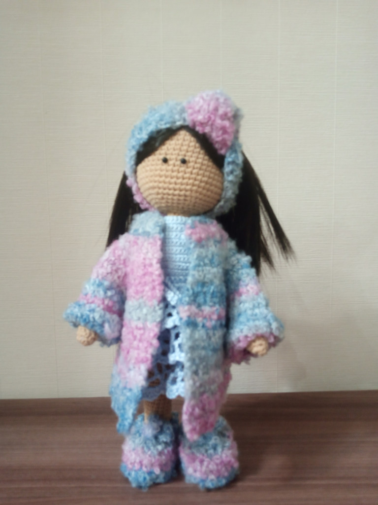 Это моя первая кукла, связана для мое дочери, которая любит переодевать кукол. Она связана по образам вальдорфских кукол крючком. Одежду можно снимать, волосы расчесывать и делать прически, очень мягкая и уютная девочка с пропорциями настоящего ребёнка, ростом 40 см, хорошо сидит, но стоит с опорой. Моей дочери она очень понравилась, а это для меня главное...