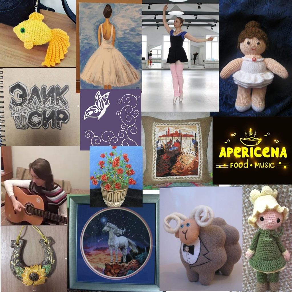 Недавно как раз сделал мини-коллаж из своих увлечений: балет, вязанные и сшитые игрушки, графический дизайн, рисование, соленое тесто, еще играю на гитаре и пою.