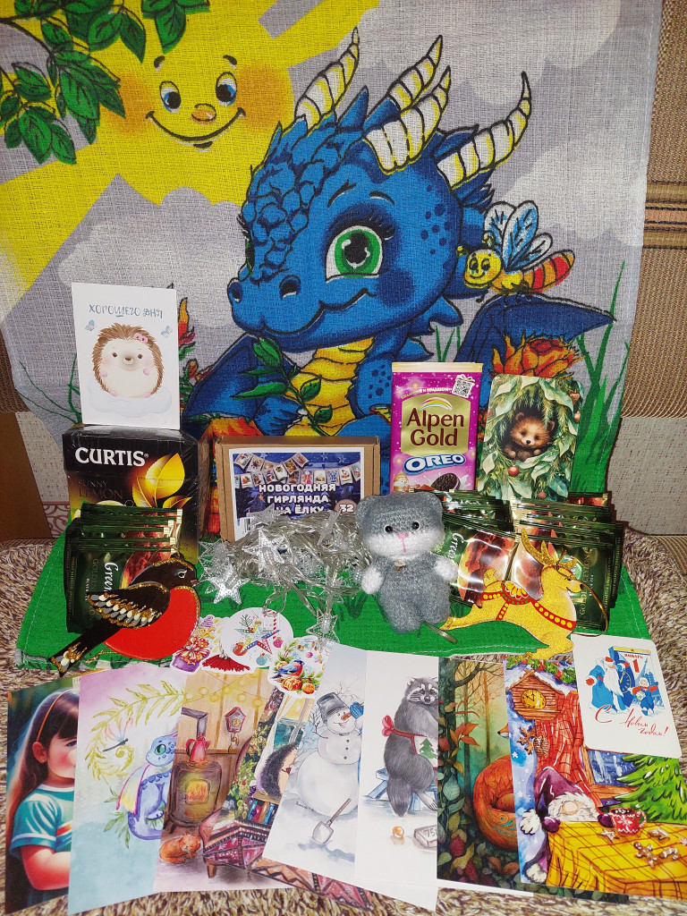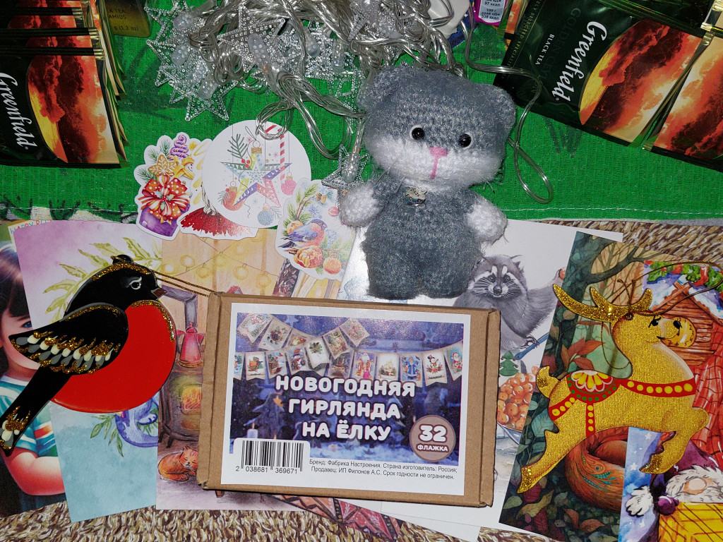 А мне тоже прилетела сюрпризная посылка от Иры @Irina-08 . A внутри было столько всего. Полотенечко с дракошей и солнышком, гирлянда-снежинки на ёлочку, гирлянда новогодняя из флажков, деревянные ёлочные игрушки(уже висят на ёлочке). Открыточки красивые в мою коллекцию, наклеечки, календарики. Чаёк вкусный и шоколадка. А привёз все подарки симпатичный маненький котик.