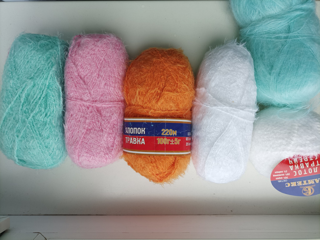 4 мотка КХТ вес: бирюзовый 94 гр розовый 74 гр белый 82 гр. Оранжевый целый. Плюс моток травка стрейтч и моток мохера в придачу. за все 1000 руб плюс доставка